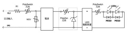 驅動輸出上的PolySwitch組件有助於防止因有害短路或其他負載異常而受損,為了充分發揮PolySwitch組件的作用,可以與金屬芯電路板或LED散熱片熱接,此外,與LED並置的PESD組件也可以對靜電放電加以保護。