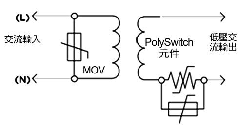 在照明係統中采用第二類功率源可成為降低成本、提高彈性的重要因素之一。固有的有限功率源,如變壓器、電dian源yuan供gong應ying器qi或huo電dian池chi等deng,可ke以yi包bao含han保bao護hu組zu件jian,隻zhi要yao不bu依yi靠kao它ta們men限xian製zhi第di二er類lei功gong率lv源yuan的de輸shu出chu即ji可ke。非fei固gu有you型xing的de有you限xian功gong率lv源yuan,按an照zhao定ding義yi,具ju有you一yi個ge分fen立li保bao護hu組zu件jian,當dang電dian流liu和he能neng量liang輸shu出chu達da到dao預yu定ding值zhi時shi它ta會hui自zi動dong中zhong斷duan輸shu出chu,各ge種zhong電dian路lu保bao護hu組zu件jian都dou有you助zhu於yu提ti供gongLED照明應用第二類功率源的安全操作。圖4表示了一種協同保護策略的工作原理,它在交流輸入上采用了一個MOV,在輸出電路分支上采用了一個PolySwitch組件,可以幫助廠商滿足UL 1310第35.1小節針對開關和控製裝置的過載試驗要求。