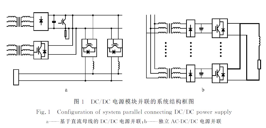 DC/DC電源並聯有兩種拓撲結構,一種是采用輸入直流母線結構,其係統結構框圖如圖1a所示,主要包括整流變壓器和不可控二極管整流電路,N 路DC/DC變換器,泵升電壓抑製電路等;另一種是采用獨立的AC-DC/DC電源並聯,係統結構圖如圖1b所示。