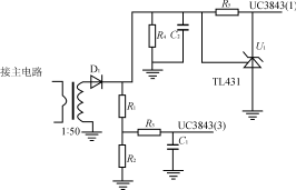電流反饋電路采用電流互感器檢測開關管上的電流,原理如圖2所示。電流互感器的輸出分為電流瞬時值反饋和電流平均值反饋兩路,R2上電壓反映電流瞬時值,開關管上的電流增大會使UR2增大,當UR2大於1V時,UC3843芯片輸出脈衝關斷。調節R1、R2分(fen)壓(ya)比(bi)可(ke)改(gai)變(bian)開(kai)關(guan)管(guan)的(de)限(xian)流(liu)值(zhi),實(shi)現(xian)電(dian)流(liu)瞬(shun)時(shi)值(zhi)的(de)逐(zhu)周(zhou)期(qi)比(bi)較(jiao),這(zhe)屬(shu)於(yu)限(xian)流(liu)式(shi)保(bao)護(hu)。輸(shu)出(chu)脈(mai)衝(chong)關(guan)斷(duan),實(shi)現(xian)對(dui)電(dian)流(liu)平(ping)均(jun)值(zhi)的(de)保(bao)護(hu),這(zhe)屬(shu)於(yu)截(jie)流(liu)式(shi)保(bao)護(hu)。兩(liang)種(zhong)過(guo)流(liu)保(bao)護(hu)互(hu)為(wei)補(bu)充(chong),使(shi)電(dian)源(yuan)更(geng)為(wei)安(an)全(quan)可(ke)靠(kao)。采(cai)用(yong)電(dian)流(liu)互(hu)感(gan)器(qi)采(cai)樣(yang)使(shi)控(kong)製(zhi)電(dian)路(lu)與(yu)主(zhu)電(dian)路(lu)隔(ge)離(li),同(tong)時(shi)與(yu)電(dian)阻(zu)采(cai)樣(yang)相(xiang)比(bi)降(jiang)低(di)了(le)功(gong)耗(hao),有(you)利(li)於(yu)提(ti)高(gao)整(zheng)個(ge)電(dian)源(yuan)的(de)效(xiao)率(lv)。