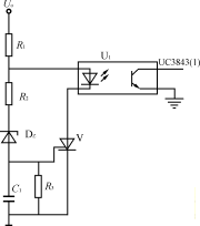 圖5為輸出過電壓保護電路。穩壓管DZ的擊穿電壓稍大於輸出電壓額定值,輸出正常時,DZ不導通,晶閘管V門極電壓為零,不導通。當輸出過壓時DZ擊穿,V受觸發導通,使光耦輸出三極管電流增大,通過UC3843控製開關管關斷。