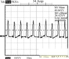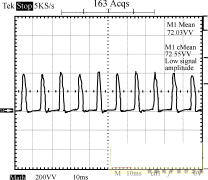 圖8~圖10為輸入電壓220V的條件下,輸出端的負載狀況分別為空載、半載和全載時,輸入端的功率波形圖。由這3個圖可以看出,輸入功率是個脈衝序列,周期為10ms,即每半個工頻周期電源輸入端通過整流橋為輸入平滑濾波電容充一次電。測量輸入功率時串聯於輸入端的采樣電阻為2.0Ω,因此功率為圖示值除以2。半載時輸出功率為:12.3662/10=15.29W,全載時輸出功率為:12.2552/5=30.04W。電路正常工作時,漏極電壓波形如圖11所示。
