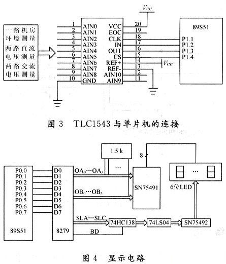 直流電壓、交流電壓以及機房溫濕度的測量選用TLC1543,TLC1543為10位11通道的A/D轉換器,與單片機的連接如圖3所示。機房環境測量(溫度、濕度)采用JWS溫濕度變送器,輸出信號為標準0~5V直流電壓信號;直流電壓的數據采集經電阻分壓後直接送至A/D轉換器,交流電壓的采集經分壓整流後也直接送至A/D轉換器。