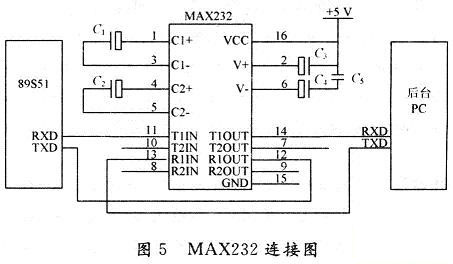 為了滿足數據傳輸距離大於200m,通信采用75LBC180全雙工485芯片,單片機通信電平和計算機電平的轉換采用MAX232完成,如圖5所示。MAX232芯片是專為電腦的RS232標準串口設計的接口電路,使用+5V單電源供電。另外。RS232到RS485的轉換可采用專用的轉換器,如BOK-60或ATC-160A無源轉換器。