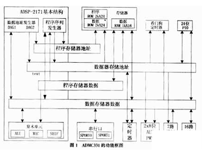 ADMC331是美國模擬器件公司(ADI)推出的基於DSP技術的電機控製器,它在內部集成了一個26MIPS(每秒百萬條指令)的定點數字信號處理器內核,同時內部還包括整套電機控製外圍線路,從而為用戶快速、高效地開發電機控製器創造了十分有利的條件。ADMC331的功能框圖如圖1所示,其主要特性如下: