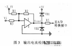 ADMC331內的A/D轉換器由7個模擬輸入通道和比較器等電路組成,數據轉換是通過判斷模擬輸入量與片內高穩定度鋸齒波的交點來實現的。考慮到A/D 轉換器能接受的電平範圍為0~+5V,因此必須將電壓互感器檢測的電壓和電流傳感器檢測的電流(轉換為電壓量)按照一定比例轉換到這個範圍內。輸出電壓和電流檢測接口電路分別如圖4和圖5所示,這部分電路的輸入阻抗應比較大,以盡量減少對設備信號的影響,並且輸出阻抗應同A/D轉換器的輸入阻抗相匹配。