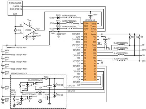 一個簡單的電池監視器和平衡係統如圖 1 所示。該電池監視係統的硬件是圍繞高度集成的 LTC6803-1 多節電池監視 IC 設計的。每個 LTC6803-1 能測量多達 12 節電池,並允許以可連接多個 IC 的串行菊花鏈形式連接,從而使一個係統能通過一個串行端口監視超過 100 個ge電dian池chi。當dang設she計ji一yi個ge電dian池chi監jian視shi係xi統tong時shi,某mou些xie規gui範fan應ying當dang給gei以yi特te殊shu考kao慮lv,首shou先xian是shi電dian池chi電dian壓ya準zhun確que度du。當dang試shi圖tu決jue定ding單dan個ge電dian池chi的de充chong電dian狀zhuang態tai時shi,電dian池chi電dian壓ya的de準zhun確que度du至zhi關guan重zhong要yao,而er且qie一yi節jie電dian池chi能neng否fou在zai接jie近jin工gong作zuo極ji限xian的de條tiao件jian下xia工gong作zuo,電dian池chi電dian壓ya的de準zhun確que度du是shi限xian製zhi因yin素su之zhi一yi。LTC6803 具 1.5mV 的分辨率,準確度為 4.3mV。這zhe將jiang允yun許xu該gai控kong製zhi器qi就jiu電dian池chi狀zhuang態tai做zuo出chu準zhun確que決jue策ce,而er不bu論lun使shi用yong的de是shi什shen麼me樣yang的de電dian池chi化hua學xue組zu成cheng。其qi次ci,電dian池chi組zu不bu平ping衡heng的de一yi個ge主zhu要yao來lai源yuan是shi,電dian池chi監jian視shi電dian路lu本ben身shen的de電dian源yuan和he備bei用yong電dian流liu的de差cha異yi。在zai汽qi車che應ying用yong中zhong,備bei用yong電dian流liu尤you其qi重zhong要yao,因yin為wei大da多duo數shu汽qi車che在zai大da部bu分fen時shi間jian裏li都dou是shi熄xi火huo的de,這zhe時shi電dian池chi監jian視shi係xi統tong處chu於yu備bei用yong模mo式shi。LTC6803 僅具 12uA 備用電流,電流範圍規定為 6uA 至 18uA,從而可保證在一個大型電池組中,最嚴重的不平衡為 12uA,這使每月不平衡低於 10mAhr。有兩個 ADC 輸入可用來監視電池溫度或其他的傳感器數據。圖 1 中顯示的設計用 Vtemp1 輸入測量電池電流。電流用 LT1999 測量。LT1999 是一款高壓雙向電流檢測放大器,具 -5V 至 80V 的輸入範圍,而且在本文所述測試情況下,設置為監視電池組高壓端的 ±10A。LTC6803 上的兩個 GPIO 引腳用來控製一個有源負載和一個充電器。當充電結束或達到放電點時,這允許 LTC6803 斷開電池與充電器或負載的連接。