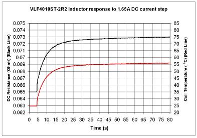 圖5中所示的測試示例在LM3554的電路中使用了VLS4010ST-2R2,直流電流階躍為1.65A。室溫時的電阻開始時為65mΩ。超過30秒之後,電感器達到穩態,電阻變為73mΩ,相應的穩態工作溫度大約為 56℃。