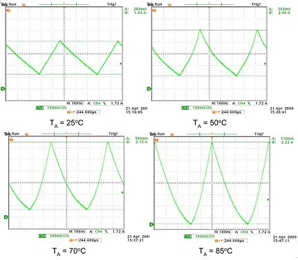 圖4左上圖顯示了在飽和點以下工作的電感器,具有正常的三角電流波形,可由(V/L×Δt)算出。在峰值電流保持相同且溫度升至50℃(右上圖)時,電感電流斜率開始增至1.76A標記附近,指示顯示電感器的飽和點隨著溫度上升而向下移動。當溫度升到70℃, 然後升到85℃時,隨著電感器達到飽和整個電流波形最終出現。
