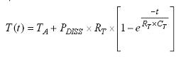 在穩態下,LEDI/NTC的ESD二極管的VF為-622mV,對應結溫 95.2℃(環境溫度為25℃時)。在穩定狀態下,測得的PFET導通電阻為154mΩ,對應結溫105℃。圖3 還描繪了LM3554的熱容。VF和RPMOS的響應表現呈現類似於一階RC的指數級上升,計算等式如下: