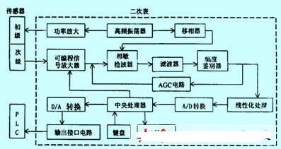 係統主要由傳感器和二次表組成。二次表主要由高頻振蕩器、可編程信號放大器、相敏檢波器、濾波器、幅度鑒別器、agc電路、線性化處理等電路構成。本文就係統關鍵部分電路的原理及作用加以論述。