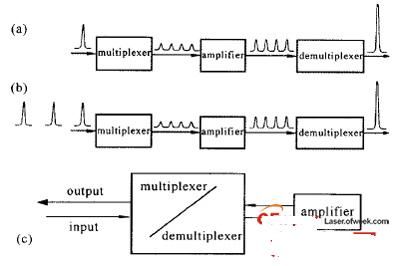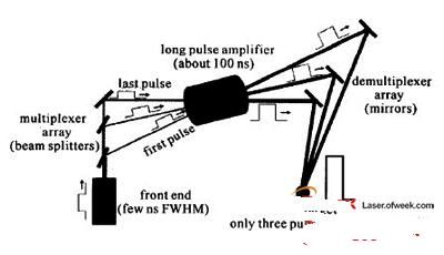 對於準分子激光放大器,由於激活介質的上能態儲能時間很短,必須連續補充瞬態儲能(Em)才能獲得高能輸出,即E=EmT/t,其中T是增益時間,t是增益恢複時間。對於電子束泵浦的準分子激光放大器,增益時間可以長達200ns,T/t≈100,這意味著對於單個要放大的短脈衝,隻能提取出很小一部分能量。為了持續提取出放大器中的儲能,通常使用光學多路編碼技術。
