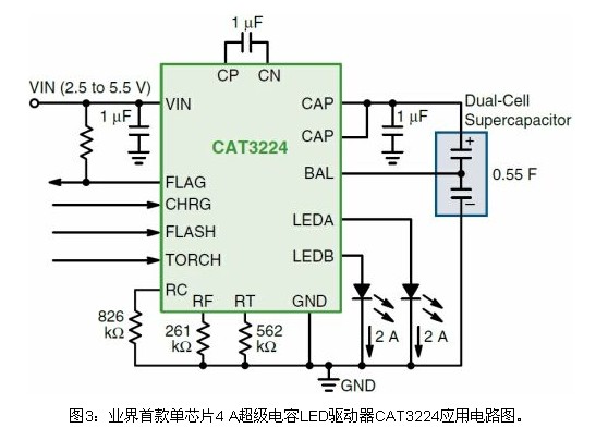CAT3224則是業界首款4 A單芯片超級電容LED驅動器(見圖3),集成了雙模1x/2x電荷泵,提供三項關鍵功能:精密的超級電容充電控製、電流放電至LED閃光的管理,以及為LED手電筒模式提供恒流。這三種模式的工作電流能以3顆外部電阻作簡易編程,能吸收達4 A的LED閃光脈衝電流。超級電容技術的高峰值電流優勢,結合CAT3224簡單的並行邏輯接口,使這器件成為采用LED替代氙氣燈的應用的極佳選擇。