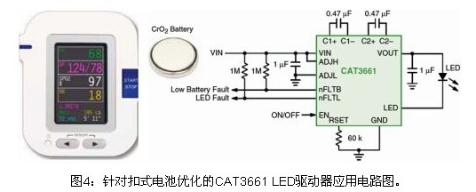 如今,越來越多的創新型便攜設備采用扣式電池(coin cell)供電,如醫療應用中的血糖儀、數字體溫計、血氧計、呼吸分析儀和生理監測儀等。由於這種電池的獨特特性以及需要長工作壽命,這些緊湊型應用需要定製的LED驅動器,不僅要管理背光,還要監測電池電量。在這類應用中,可以采用安森美半導體計劃於2010年下半年推出的CAT3661 2至2.5 V單LED驅動器。這器件同樣采用安森美半導體專利的四模(Quad Mode)電荷泵架構,能效高達92%,靜態電流低至約150 μA,提供可調節的低電池電量檢測功能,以及強固的LED故障監測、軟啟動和短路限製等保護功能,采用低高度的3 x 3 mm TQFN-16封裝,非常適合這些便攜設備應用。