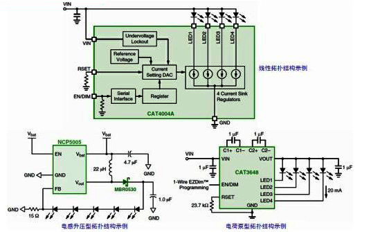 白光LED廣泛用於小型液晶顯示器(LCD)麵板及鍵盤背光以及指示器應用。高亮度LED則用於手機和數碼相機的閃光光源。這些應用需要優化的驅動器解決方案,能夠延長電池使用時間、減小印製電路板(PCB)麵積及高度。在這些應用領域,常見的LED驅動器方案涉及線性、電感型或電荷泵型不同拓撲結構,各有其特點。例如,電感型方案總能效最佳;電荷泵方案由於使用低高度陶瓷電容,占用的電路板麵積和高度極小;線性方案非常適合色彩指示器以及簡單的背光應用。安森美半導體提供所有這三種類型拓撲結構的LED驅動器方案(參見圖1),滿足用戶不同的應用需求。