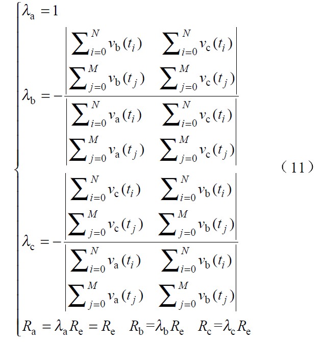 式 (11 )為相電壓不對稱係數的計算公式,其中λa ,λb 和λc 為相電壓不對稱係數,Re weibiaozhundengxiaodianzu。kejian,dangdianwangdianyabuduichengshi,weishigexiangdianliurengnengzhengquegenzongduiyingxiangdianya,gexiangdengxiaodianzuzhishibutongde。teshudi,ruguosanxiangdianyaduicheng,λa=λb=λc =1 ,則Ra=Rb=Rc=Re.