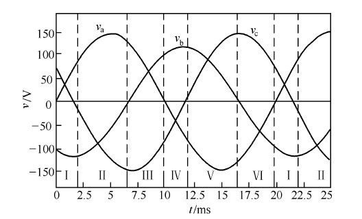 圖 1 給出了雙並聯升壓型三相整流器的主電路原理圖。另外,圖2 還給出了輸入電壓b 相幅值減少20% ,c 相相位滯後30 °時(shi)三(san)相(xiang)電(dian)壓(ya)的(de)波(bo)形(xing),並(bing)按(an)虛(xu)線(xian)劃(hua)分(fen)為(wei)六(liu)個(ge)區(qu)間(jian)。須(xu)注(zhu)意(yi)的(de)是(shi),輸(shu)入(ru)電(dian)壓(ya)不(bu)對(dui)稱(cheng)的(de)情(qing)況(kuang)不(bu)同(tong),其(qi)分(fen)區(qu)點(dian)也(ye)可(ke)能(neng)不(bu)同(tong),分(fen)區(qu)點(dian)由(you)各(ge)相(xiang)非(fei)零(ling)序(xu)電(dian)壓(ya)瞬(shun)時(shi)最(zui)大(da)幅(fu)度(du)區(qu)分(fen)點(dian)所(suo)確(que)定(ding)。依(yi)據(ju)六(liu)階(jie)段(duan)PWM 控製技術原理,三相整流器可以通過在線性周期的每一區間內控製兩個開關的通斷來實現單位功率因數。