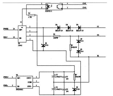 逆變器驅動電路采用日本三菱公司為驅動IGBT設計的專用集成電路M5 7962L,加少量外圍元件構成。N87C196MC輸出SPWM信號通過外圍電路放大後直接給驅動模塊,驅動模塊直接驅動IGBT管,最大可驅動400AIGBT。當M57962L檢測到IGBT管上C、E極電壓高與8V,而且此時IGBT管開通時,持續時間大於2.5 μ s,則發出故障信號,同時封鎖驅動波形,並且發出故障信號給N87C196MC,單片機產生EXTINT中斷,封鎖各路SPWM信號,高速關斷IGBT。