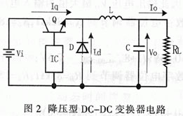 圖2所示為降壓型DC-DC變換器的典型電路,當控製器IC感應到輸出電壓Vo太低時,啟動通道上的晶體管Q給電感器L充電,同時也對電容器C充電,當輸出電壓V0上升到一個預定值時,控製器關閉通道上的晶體管Q,電感器L和電容器C上獲取的能量通過肖特基二極管構成的回路自由釋放,從電感器L到電容器C進行有效的能量傳輸會消耗一部分能量,因此加載在負載上的電壓有所下降。
