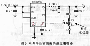 TPS62000DGS的輸出電壓可調,通過調整反饋引腳FB的電壓值來達到輸出電壓V0的變化,采用數字電位器來調節反饋引腳FB的電壓。在圖3中,H為數字電位器可調電阻器的高電壓端,L為數字電位器可調電阻器的低電壓端,W為數字電位器滑動電壓輸出端。輸出電壓的計算公式為V0=0.45V×(1+RH/RL),其中要求RH+RL≤1MΩ,每次調接的電阻值為1kΩ。3線接口可設計成單片機控製或按鍵直接控製(外擴邏輯電路),在減小數字電位器RL的阻值時,輸出電壓V0會增加。由於該器件是DC-DC降壓器件,因此輸出電壓V0最大值為輸入電壓VI。