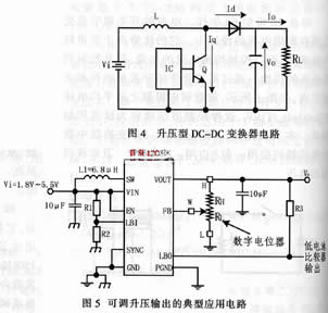 以TI公司的TPS61030型電路為例,如圖5所示,該電路是效率高達96%的同步升壓變換器。非常適合於1節鋰離子或鋰聚合物電池、2節到3節堿性電池、鎳鉻或鎳氫電池,變換產生固定輸出電壓或可調輸出電壓,輸出電壓的調節通過數字電位器調節反饋引腳FB的電壓獲得。在輸入電壓最低為1.8V時,輸出電壓為5V,輸出電流最大為1A。升壓基於一個固定頻率PWM控製器同步開關整流獲取高效率。具有關閉電源和過熱保護功能。在圖5中,H為數字電位器可調電阻器的高電壓端,L為數字電位器可調電阻器的低電壓端,W為數字電位器滑動電壓輸出端。反饋引腳FB的電壓典型值為500mA,最大允許輸出電壓為5.5V。輸出電壓的計算公式為Vo=0.5V×(1+RH/RL)。另外,該電路內含電壓基準0.5V的電池電壓比較器,輸入引腳LBI的電壓通過電池電壓分壓獲得,分壓電阻器R1和R2也可以采用數字電位器調節。