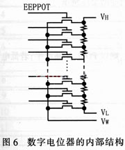數字電位器的內部結構如圖6所示,它用控製MSO管的開關來調節滑動端VW在VH和VL之間多個等值電阻的位置,抽頭數越多,等值電阻越多。調整的範圍越寬,對DC-DC變換器的輸出電壓調整幅度越小。