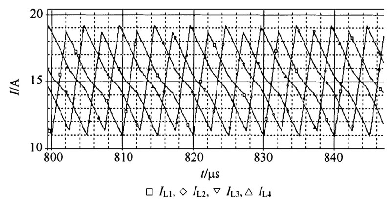 圖6 所示為濾波電感的電流波形, 從圖6 可以看出, 4 個濾波電感的電流輪流充電, 如果一個濾波電感在充電, 其餘3 個電感必須在放電, 在死區時間內, 4 個濾波電感都在放電。