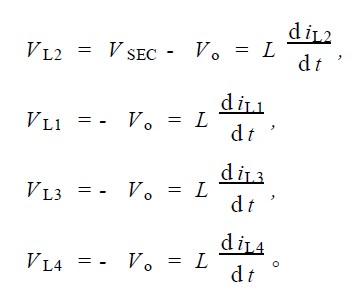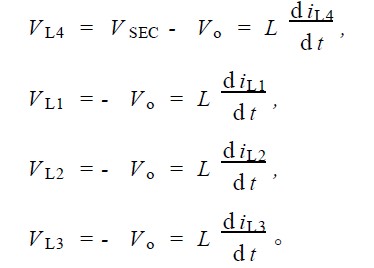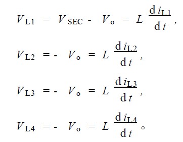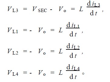 1) S1 導通, S2 截止; S3 截止, S4 , S5 , S6 均導通。由於S4 , S5 , S6 的導通, 第一變壓器副邊繞組下端為零電位,第二變壓器副邊繞組上、下端均為零電位,電感L1 上電流上升, L2 , L3 , L4 上電流下降。