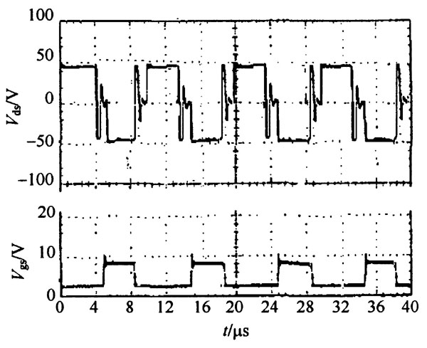 通過理論研究及仿真分析, 可以看出, 交錯並聯的低壓大電流DC - DC 變換器具有良好的性能,在輸出為1125 V/ 60 A 的情況下, 輸出電流紋波可以降到很小。為了進一步說明這種拓撲結構的可行性, 用實驗結果驗證。實驗電路見圖4 , 實驗參數和仿真相同, 最後得到如圖9 所示的實驗波形。圖9 中, V gs為一次側一個MOSFET 的門極驅動電壓波形, V ds則為相應的MOSFET 的柵源電壓波形,從圖9 可以看出, 實驗結果所得波形同圖5 的理論分析結果十分吻合, 所提出的方法是可行的。其中, 變壓器選用R2 KB 軟磁鐵氧體材料製作的GU22 磁心, 原副邊的匝數分別為8 匝和1 匝; 電感選用寬恒導磁材料IJ 50h 製作的環形鐵心T5 - 10 - 215 ,匝數為8 匝。