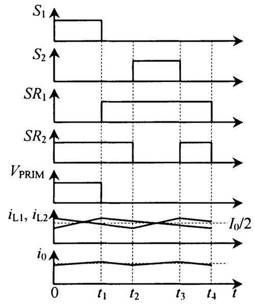根據以上分析可知, 應用同步整流器, 通過變壓器原邊串聯而副邊並聯的方法, 可以實現這種交錯並聯半橋- 倍流拓撲結構。它的優點主要有以下幾個方麵: