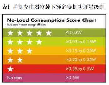 這zhe些xie關guan注zhu的de結jie果guo是shi采cai取qu一yi係xi列lie措cuo施shi來lai提ti升sheng效xiao率lv和he降jiang低di空kong載zai功gong耗hao的de需xu求qiu。其qi中zhong最zui新xin最zui嚴yan格ge的de是shi由you全quan球qiu前qian五wu大da手shou機ji廠chang商shang提ti出chu的de一yi項xiang自zi願yuan性xing的de充chong電dian器qi星xing級ji製zhi協xie定ding,用yong以yi標biao誌zhi在zai充chong電dian完wan成cheng之zhi後hou,充chong電dian器qi仍reng插cha在zai壁bi式shi插cha座zuo上shang時shi的de耗hao能neng量liang。該gai星xing級ji製zhi從cong0星級開始,最高5星級。空載下額定待機功耗大於0.5W的充電器為0星級標簽,待機功耗小於0.03W(30mW)的為5星級(見表1)。通過比較,大多數現有手機的待機功耗在150~300mW範圍。