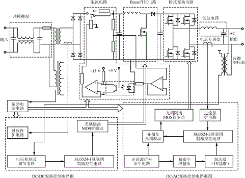 圖1示出了係統主電路和控製電路框圖。交流輸入電壓經過共模抑製環節後,再經工頻變壓器降壓,然後整流得到一個直流電壓,此電壓經過Boost電路進行升壓,在直流環上得到一個符合要求的直流電壓350V(50Hz/220V交流輸出時)。DC/AC變換采用全橋變換電路。為保證係統可靠運行,防止主電路對控製電路的幹擾,采用主、控(kong)電(dian)路(lu)完(wan)全(quan)隔(ge)離(li)的(de)方(fang)法(fa),即(ji)驅(qu)動(dong)信(xin)號(hao)用(yong)光(guang)耦(ou)隔(ge)離(li),反(fan)饋(kui)信(xin)號(hao)用(yong)變(bian)壓(ya)器(qi)隔(ge)離(li),輔(fu)助(zhu)電(dian)源(yuan)用(yong)變(bian)壓(ya)器(qi)隔(ge)離(li)。過(guo)流(liu)保(bao)護(hu)電(dian)路(lu)采(cai)用(yong)電(dian)流(liu)互(hu)感(gan)器(qi)作(zuo)為(wei)電(dian)流(liu)檢(jian)測(ce)元(yuan)件(jian),其(qi)具(ju)有(you)足(zu)夠(gou)快(kuai)的(de)響(xiang)應(ying)速(su)度(du),能(neng)夠(gou)在(zai)MOS管允許的過流時間內將其關斷。