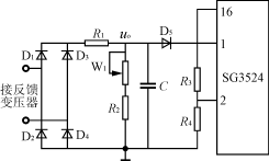 反饋調壓電路圖如圖7所示。當逆變器正常工作時,逆變器的輸出信號接反饋變壓器,其二次電壓經整流,濾波,分壓得到反饋電壓uo,顯然,uo的大小正比於逆變器的輸出電壓。調節W1可調節負反饋電壓的大小,從而調節逆變器輸出電壓的幅值。uo控製信號被送到SG3524-1芯片的誤差放大器的反相端腳1。誤差放大器的同相端腳2接參考電平。這樣,SG3524的輸出脈衝的占空比就受到反饋信號的控製。調節過程是這樣的,當逆變器輸出因突加負載而降低時,它會使加在SG3524-1的腳1的輸入反饋電壓下降,這會導致SG3524-1輸出脈衝占空比增加,從而使得Boost電路輸出電壓升高,逆變橋的直流電壓升高,逆變器輸出交流電壓升高。反之亦然。可見,正是通過SG3524-1的脈寬調製組件的控製作用,實現了整個逆變器的輸出自動穩壓調節功能。