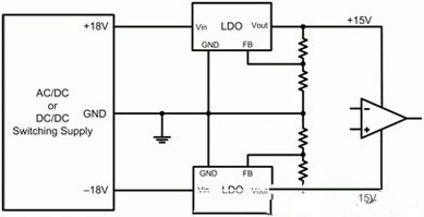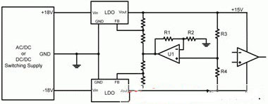 圖2顯示了一個典型運算放大器電源電路的示意圖。此處,一個開關電源提供一個正18V和一個負18V。兩低壓降(LDO)線性穩壓器進一步將±18V調節至±15V。該LDO一般安裝在電源和運算放大器之間,旨在降低開關電源產生的高頻開關噪聲。LDO具有較高的電源抑製(以比率表示,PSRR),其減弱了寬帶頻率下LDO輸入的噪聲。