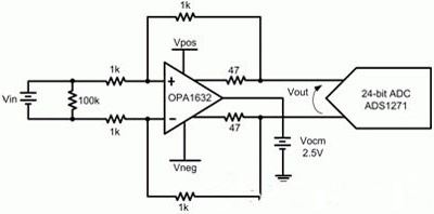 由於運算放大器的PSRR進一步降低了電源的微小變化,因此您可能會錯誤地得出如下結論:電(dian)源(yuan)電(dian)壓(ya)的(de)微(wei)小(xiao)變(bian)化(hua)在(zai)係(xi)統(tong)中(zhong)影(ying)響(xiang)極(ji)小(xiao)或(huo)者(zhe)沒(mei)有(you)影(ying)響(xiang)。作(zuo)為(wei)一(yi)個(ge)定(ding)量(liang)舉(ju)例(li),我(wo)們(men)可(ke)對(dui)一(yi)個(ge)全(quan)差(cha)動(dong)運(yun)算(suan)放(fang)大(da)器(qi)進(jin)行(xing)分(fen)析(xi),其(qi)將(jiang)信(xin)號(hao)緩(huan)衝(chong)至(zhi)一(yi)個(ge)24位ADC。