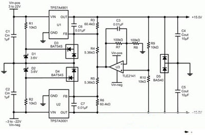圖5所示電路使用一個如TPS7A3001等可調節、負輸出電壓LDO線性穩壓器,以及如TPS7A4901等可調節、正輸出電壓LDO。U3、R7-R10和C3均為增加的組件,用於追蹤。R1、R2、D1-D5均為增加組件,用於將反饋引腳的電壓控製在其各自產品說明書額定的絕對最大電壓範圍內。