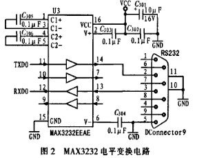 係統產生的信號需要經過電平變換,轉換成RS-232電平,與計算機通信。這裏采用MAX3232為核心電平變換電路。其原理圖如圖2所示。
