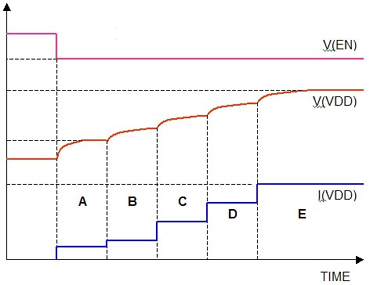 在A部分,通過限製流過分斷開關的電流來減少負載電容充電時的浪湧電流;在B部分,升壓轉換器的開始電流限製在25%;在C部分,電流限製設在50%;在D部分電流限製為75%;在E部分,電流限製為100%。