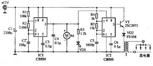 IC1、IC2選用兩塊時基電路CB555,或選用一塊雙時基電路CB556。注意,CMOS時基電路CB7555或CB7556因驅動電流較小,不適合本機使用。開關管VT選用2SC2073等中功率管。二極管VD2選用FR104等快恢複整流管。風扇M可選用12V、150mA左右的計算機CPU用的散熱風扇,其體積較小、厚度薄、噪聲很低,比較適合本製作使用,也可用12V玩具電機配以自製的風扇葉片代用。