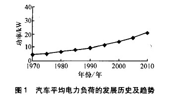 汽車電源的電壓從上世紀50年代的6V改為12V,己有50多年的曆史。自1990年開始,汽車用電量每年以5%~8%的比例增加,其平均電力負荷的發展曆史與趨勢見圖1。隨著汽車技術的不斷進步,將會有越來越多的電氣及電子係統被應用到汽車上。