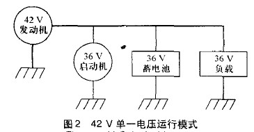 在新的電氣係統中,有兩種實施方案:一種是全車42V單一電壓方案;另一種是42V/14V雙電壓方案5。