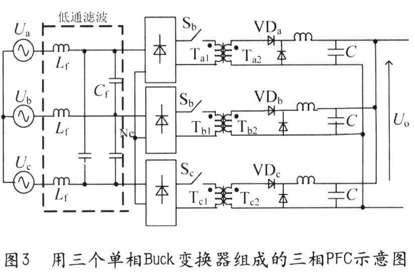 圖3用三個單相Buck變換器組成的三相PFC示意圖,圖3所示Buck型xing電dian路lu的de結jie構gou比bi較jiao簡jian單dan,同tong全quan橋qiao電dian路lu相xiang似si,由you於yu隔ge離li變bian壓ya器qi反fan射she電dian壓ya的de影ying響xiang,其qi相xiang對dui於yu反fan激ji電dian路lu來lai說shuo也ye有you較jiao大da的de電dian流liu失shi真zhen,但dan其qi諧xie波bo仍reng可ke以yi限xian定ding在zai比bi較jiao低di水shui平ping,達da到daoIEC—1000的要求。另外,其可實現的功率等級的大小不如全橋高,但比反激式電路要大。