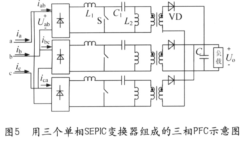 在Boost變bian換huan中zhong,傳chuan統tong的de隔ge離li在zai此ci種zhong情qing況kuang下xia的de應ying用yong並bing不bu理li想xiang,因yin為wei在zai電dian流liu連lian續xu情qing況kuang下xia,器qi件jian將jiang產chan生sheng高gao的de電dian壓ya應ying力li,在zai電dian流liu斷duan續xu情qing況kuang下xia將jiang產chan生sheng較jiao大da的de輸shu入ru電dian流liu失shi真zhen。圖tu5所示的電路是用隔離SEPIC電路組成的三相PFC電路,SEPIC變換器的輸入端類似於Boost電路,因此具有Boost電路的優點,如有低的輸入電流失真和更小的EMI濾波器。在輸出端SEPIC電路像反激式變換器,從而不必以增加電壓為代價達到隔離的作用。