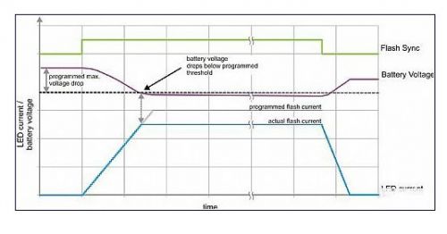 TI 擁有一種監控電池電壓的閃光燈驅動器技術。要獲得穩定的 LED 電流波形並且避免過多的電池壓降,閃光燈驅動器要主動控製 LED 電流上升/下降順序。在上升階段(上升斜率為 25mA/12?s),要對輸入電壓進行監控。如果輸入電壓降至某個設定閾值以下,則器件即刻停止讓 LED 電流進一步上升至該設定閾值,並將閃光燈電流保持在實際電平,參見圖 5。