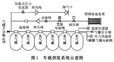 為了保證燃料電池汽車的安全穩定運行,需要設計一套安全有效的供氫係統。在燃料電池汽車上,供氫係統一般包括電磁閥、安全閥、溢流閥、熱熔栓、手動截止閥、溫度傳感器和壓力傳感器等在內的輔助安全裝置,其示意圖如圖 1 所示[9]。chezaigongqingxitonganquancuoshiyingcongyufangyujiankongliangfangmianzheshou。congyufangdejiaodulaishuo,bizheyiguoneiyanfaderanliaodianchizhongbacheweili,geichulechezaigongqinganquanshili。