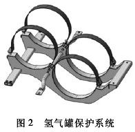 ( 2) 氫qing氣qi罐guan保bao護hu。高gao壓ya氫qing氣qi罐guan的de固gu定ding支zhi架jia和he鋼gang帶dai應ying有you足zu夠gou的de強qiang度du,以yi保bao證zheng在zai碰peng撞zhuang過guo程cheng中zhong,高gao壓ya氫qing氣qi罐guan的de動dong態tai位wei移yi不bu會hui太tai大da,避bi免mian造zao成cheng連lian接jie管guan路lu的de斷duan裂lie、變形和氫氣的大量泄漏。何健[13]基於顯式有限元理論,按照 CMVDR294 法(fa)規(gui)對(dui)國(guo)內(nei)自(zi)主(zhu)開(kai)發(fa)的(de)某(mou)燃(ran)料(liao)電(dian)池(chi)轎(jiao)車(che)進(jin)行(xing)正(zheng)麵(mian)碰(peng)撞(zhuang)分(fen)析(xi),對(dui)比(bi)分(fen)析(xi)兩(liang)種(zhong)氫(qing)氣(qi)罐(guan)保(bao)護(hu)係(xi)統(tong)設(she)計(ji)方(fang)案(an)的(de)計(ji)算(suan)結(jie)果(guo),提(ti)出(chu)了(le)安(an)全(quan)有(you)效(xiao)的(de)氫(qing)氣(qi)罐(guan)保(bao)護(hu)方(fang)案(an),即(ji)氫(qing)氣(qi)罐(guan)保(bao)護(hu)係(xi)統(tong)采(cai)用(yong)整(zheng)體(ti)式(shi)設(she)計(ji)。如(ru)圖(tu) 2 所示,氫氣罐框架通過 3 根橫梁和 2 根縱梁將兩個氫氣罐集成到一個框架總成。縱梁截麵為“Π”形,由幾塊板材拚焊而成,中部設計出兩個圓弧形凹槽,可以對氫氣罐進行有效的固定和保護。