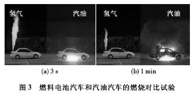 邁阿密大學的 MICHAEL[15]分別對燃料電池汽車和汽油汽車的燃燒進行對比試驗,將兩輛汽車分別用氫氣和汽油做燃料,然後做泄漏點火試驗,如圖 3 所示。點火 3 s 後,高壓氫氣產生的火焰直噴上方,而汽油由於比空氣重,則從汽車的下部著火。到 1 min 時,氫氣作燃料的汽車隻有漏出的氫氣在燃燒,汽車沒有大問題; 而汽油車則早已成為一個大火球,完全燒光。這說明氫氣汽車比現在普遍使用的汽油車安全得多。