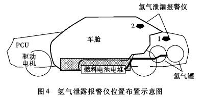 如果燃料電池汽車發生車內氫氣泄露,也存在一定的危險性,劉延雷[16]對(dui)燃(ran)料(liao)電(dian)池(chi)汽(qi)車(che)內(nei)氫(qing)氣(qi)泄(xie)露(lu)擴(kuo)散(san)進(jin)行(xing)數(shu)值(zhi)模(mo)擬(ni)研(yan)究(jiu),考(kao)慮(lv)了(le)氫(qing)氣(qi)在(zai)車(che)內(nei)泄(xie)露(lu)擴(kuo)散(san)後(hou)的(de)危(wei)險(xian)區(qu)域(yu)分(fen)布(bu),研(yan)究(jiu)結(jie)論(lun)可(ke)以(yi)為(wei)車(che)內(nei)預(yu)警(jing)用(yong)氫(qing)氣(qi)泄(xie)露(lu)報(bao)警(jing)儀(yi)的(de)放(fang)置(zhi)( 見圖 4) yijiranliaodianchiqichedeanquanshejitigongcankao。zaicheneifashengqingqixieludeqingkuangxia,zhengchekongzhixitongnengtongguocheshanganzhuangdeqingqichuanganqixinhaojiangqingqigongyingxitongqieduan,zheyidianyuchuantongqichezaifashengpengzhuangqingkuangxiazidongqieduanyouluxitongyiyang,yibaozhangranliaodianchiqichefashengcheneiqingqixielushideanquan。