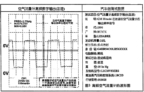 高頻數字式空氣流量計出現在通用汽車3.8L V6型發動機上,它是日立(Hitachi)生產的傳感器。此外,高頻數字式空氣流量計還應用於淩誌(Lexue)以及其它汽車中。傳感器的脈衝大多數幅值為5V,怠速時頻率:2.77kHz。
