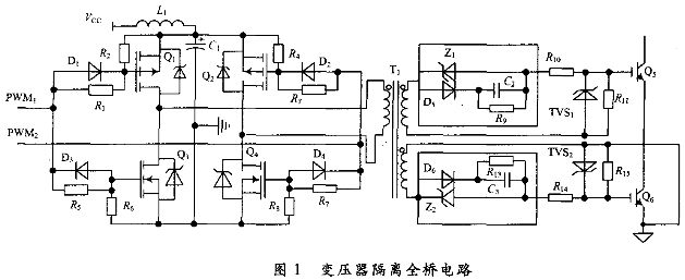 在中頻脈衝滲碳電源中,能快速進行過流保護是至關重要的,而驅動脈衝無延遲地傳輸,對實時過流保護起至關重要作用;同時為了減少開關損耗,還要求很陡的驅動脈衝上升沿和下降沿;一些特殊場合要求緊湊而簡潔、不附加驅動電源等。綜合考慮以上要求,采用變壓器隔離全橋驅動電路,其電路如圖1所示。